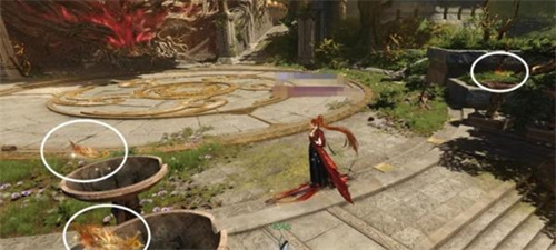 1、前往天羲遗城的圣辉祭坛,然后在图示位置的三个红圈里找到三根赤金羽。