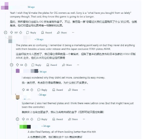 玩家集体声讨索尼在《羊蹄山之魂》限定外壳上的区别对待。一位愤怒的玩家吐槽:“索尼就是家'只看新人笑'的公司...”,另一条高赞评论则指责官方“以最快速度抛弃了初代机型”。有玩家建议关注第三方厂商是否会推出适配初代机型的山寨外壳。