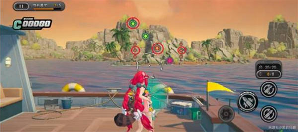 先用扩散弹药清理红圈内的橙、绿靶,切换常规弹药快速连射两个彩靶。