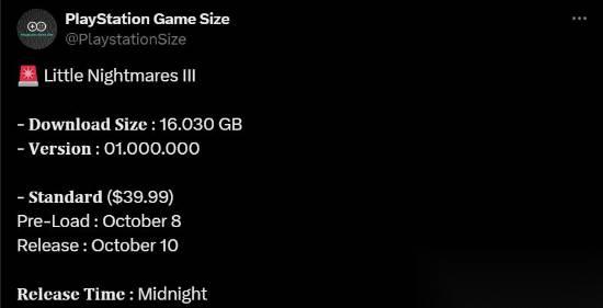 据推主PlayStationGameSize消息,《小小梦魇3》可以在10月8日,也就是正式发售的前两天开始预载,PS5版文件大小为16.03G。Xbox版大小约15G,PC和NS上的文件大小可能差不多。