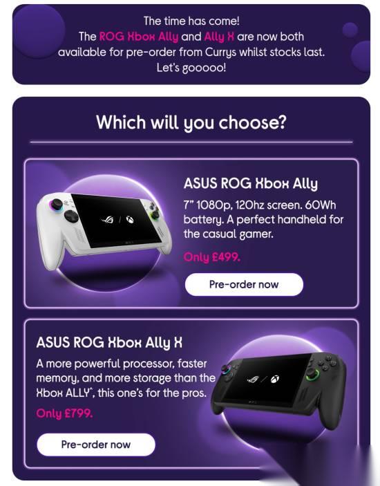 Xbox掌机Xbox Ally X的售价曝光。根据英国零售商Currys发给客户的一封电子邮件,Xbox Ally和Xbox Ally X在英国的售价为499英镑/799英镑。
