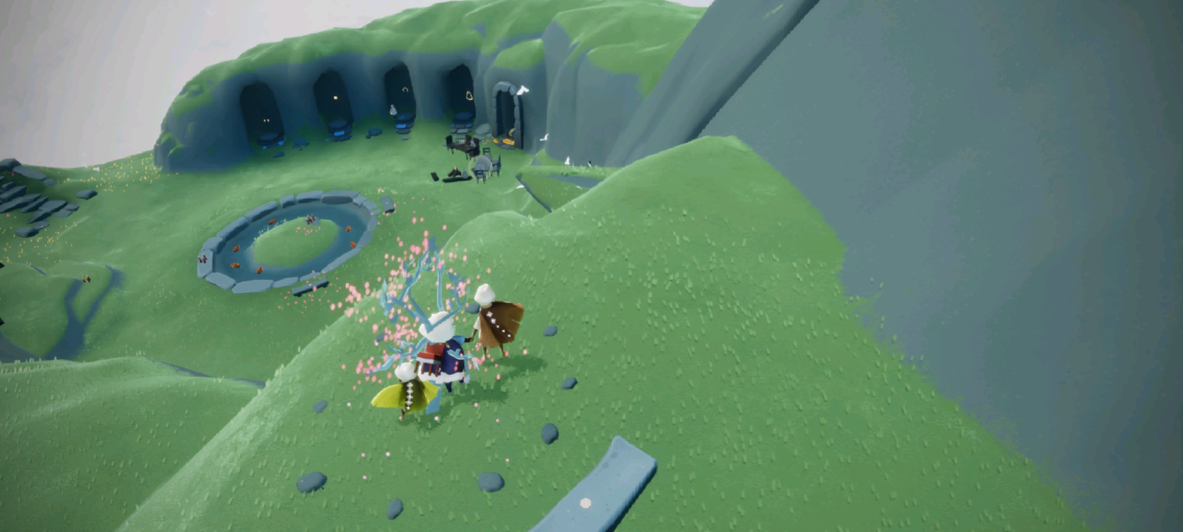 建议先收集至少5个光之翼再尝试飞越悬崖,这样会有更充足的能量储备。飞行过程中如果遇到困难,可以尝试从6翼附近的高点土坡起跳,或者借助场景中的气流和风柱抬升高度。每次煽动斗篷都会消耗能量,所以要有节奏地点击,不要连续快速按键哦。