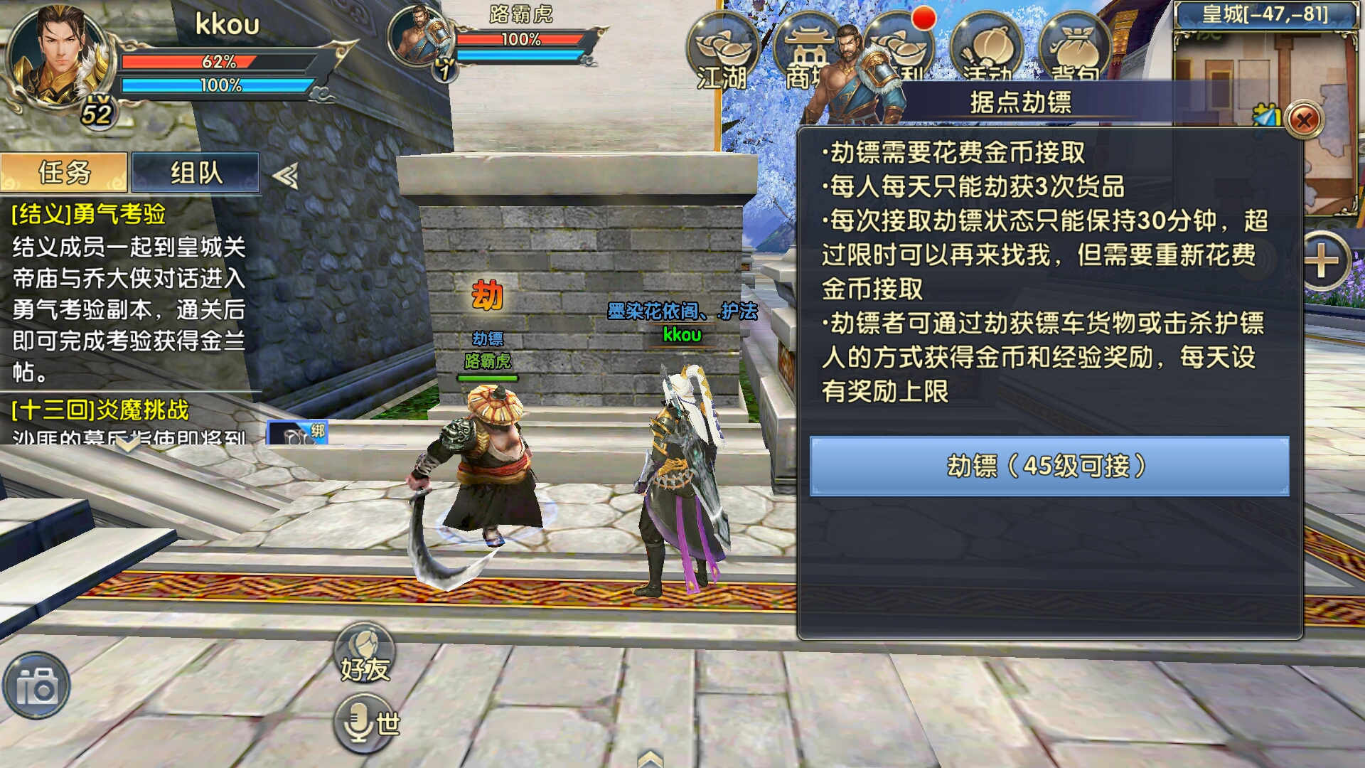 在游戏玩法与任务设计层面,护卫与反派的关联直接转化为玩家需要应对的具体挑战与目标。玩家常需接受击败特定护卫的任务,例如在逍遥游第二阶段任务中,需按坐标寻找并击败四个护卫,每个护卫点设有刷怪器,需踩踏触发才能召唤。另与反派相关的玩法则可能体现为悬赏任务或阻止其破坏行动,反派恶人可能成为玩家的击杀目标,玩家通过劫镖或切磋击杀他人积累作恶值。这使得护卫与反派共同构成了玩家在PVE(玩家对环境)与特定PVP(玩家对玩家)玩法中的核心交互对象,其存在共同搭建了从战斗难度适中的护卫战到需要多人协作的反派挑战的难度阶梯,为玩家提供了获取任务奖励与稀有资源的关键途径。