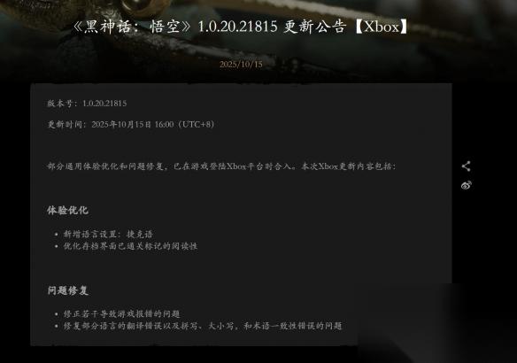 黑神话 悟空 Xbox版1.0.20.21815更新上线