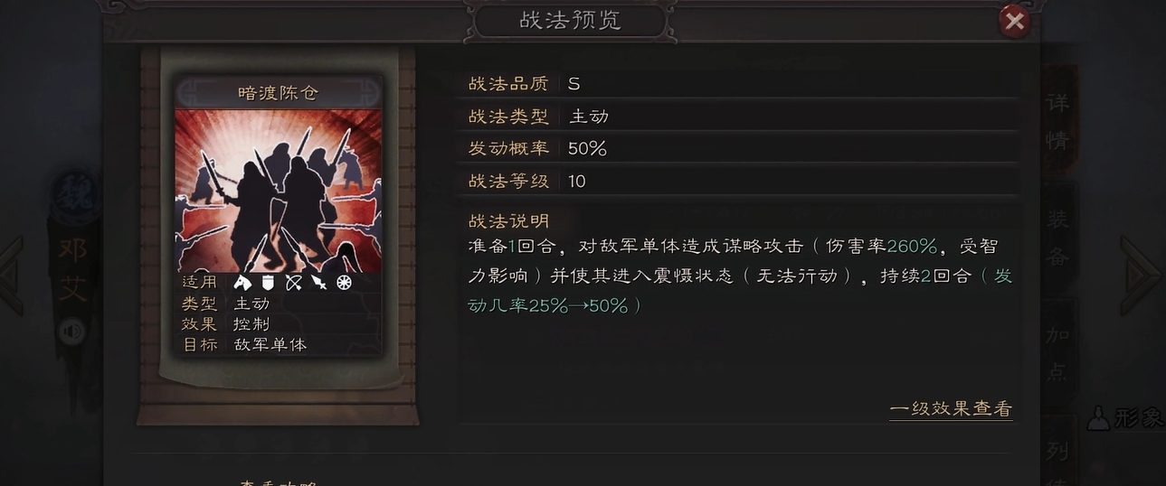 战法选择方面,潘凤除自带战法外推荐携带白眉+落凤组合,白眉可进一步提升主动战法发动率至51%,落凤则提供强力控制。替代方案可选择轻勇飞燕+避实击虚的纯输出路线,前者随机造成2-4段伤害,后者专攻低统率目标。兵书建议选用一鼓作气+执锐+胜战的组合,重点强化破阵后的爆发伤害。装备锻造优先选择提升武力与速度的武器、防具,特技推荐凝神或疾驰进一步优化输出效率。