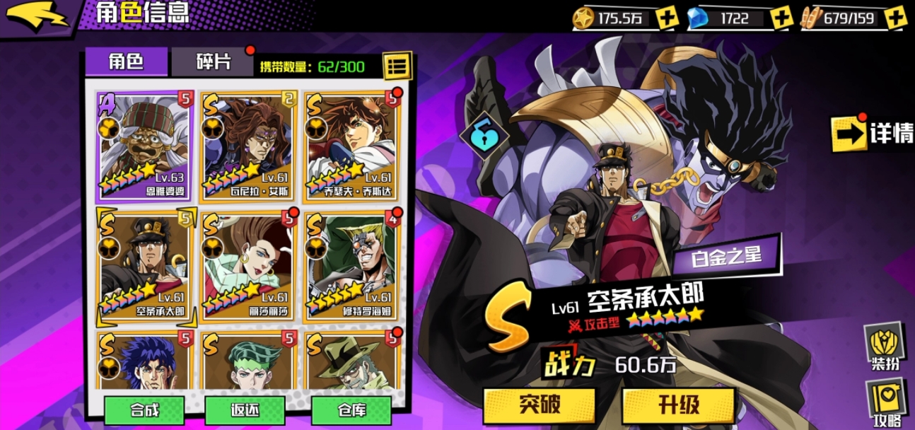 S级角色在游戏中具有明确的战略价值,他们往往在攻击、防御或辅助某一领域拥有顶尖的能力。空条承太郎作为三代JOJO中的知名角色,其替身能力使其成为走单核输出路线的绝佳选择,能够在战斗中承担主要的伤害制造职责。乔瑟夫凭借其黄金体验的能力,也能以强大的姿态应对各种战斗局面,是另一种风格的核心输出角色。这些S级角色是玩家应对高难度挑战和推进主线剧情的基石。