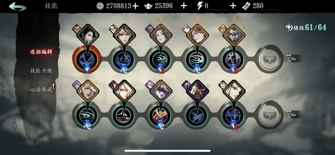 技能链构建遵循3+3或4+2的短链原则,上链推荐影杀+飞杀+凝气之刃+瞬空杀的组合,下链采用真飞燕腿+旋飞杀+幻灭+夜色。加点时上链侧重伤害倍率提升,瞬空杀作为终结技需点满;下链则强化功能性,幻灭的无敌时长和夜色的吸血比例需优先加满。精研分支选择上,影杀应点出范围扩展以增强起手稳定性,夜色推荐选择吸血量提升而非范围扩大,幻灭则必选破甲加深分支。